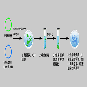 慢病毒表达载体包含了包装、转染、稳定整合所需要的遗传信息。慢病毒包装质粒可提供所有的转录并包装shRNA到重组的假病毒载体所需要的所有辅助蛋白。为产生高滴度的病毒颗粒,需要利用表达载体和包装质粒同时共转染细胞,在细胞中进行病毒的包装,包装好的假病毒颗粒分泌到细胞外的培养基中,离心取得上清液后,可以直接用于宿主细胞的感染,目的基因进入到宿主细胞之后,经过反转录,整合到基因组,从而高水平的表达效应分子。