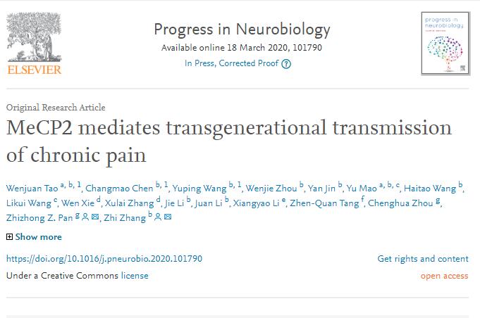 2020年3月18日,来自中国科学技术大学张智课题组的研究工作者在神经科学权威杂志《Progress in Neurobiology》(影响因子:10.658)发表了一篇题为“MeCP2 mediates transgenerational transmission of chronic pain”的文章,确定了初级体感皮层(S1)谷氨酸神经元中DNA甲基-CpG结合蛋白2 (MeCP2)在疼痛的跨代传递中的重要作用。在雌鼠S1-Glu神经元中干扰MeCP2表达,使子代疼痛敏化消失,而过表达MeCP2,导致子代疼痛敏化。